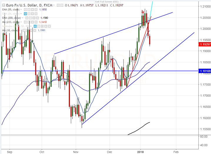 - EUR/USD declined sharply after forming a minor top around 1.20891. The pair broken major trend lien support 1.2000 and declined almost 75 pips. It is currently trading around 1.19290.