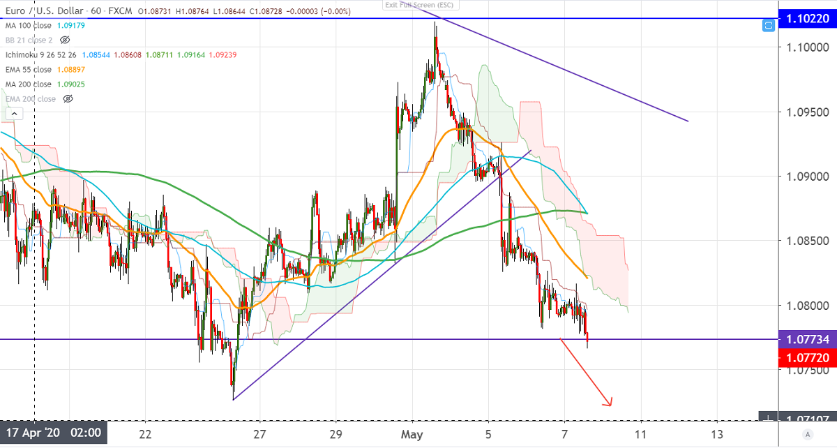 EURUSD trades lower after a minor jump till 1.08164 today despite weak US employment data. The number of people applied for unemployment benefits during the weekend of May 2nd came to 3169000 much worse than the forecast of 3 million. It hits a low of 1.07765 and is currently trading around 1.07832.