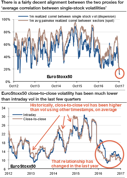 Volatility across all indices in Europe has continued to sink slowly as if pulled down in a quagmire. That may be a fitting analogy because volatility has been sticky and on a downward trend through the year. The 1-month realized volatilities on the CAC40, DAX30 and SMI indices have reached their lowest levels since the inception of these indices, while the volatilities on EuroStoxx50, SMI and AEX are close to all-time lows. Long vol positions have been painful to carry for a while, and unfortunately, investors may be looking at more of the same for a while.