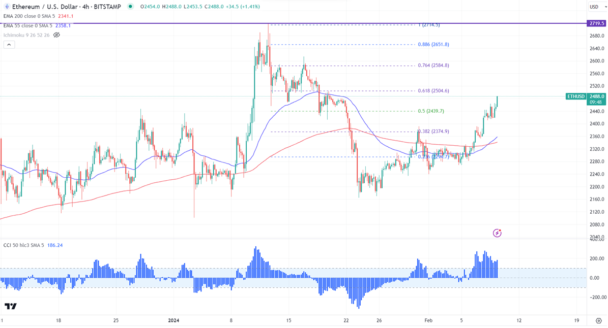 ETHUSD is trading higher following the footsteps of BTC. It hit a high of $2481 at the time of writing and is currently trading around $2480.