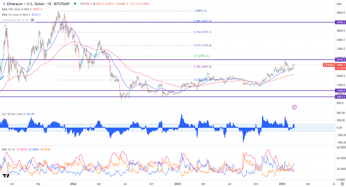 ETHUSD is consolidating after a minor pullback. It hit a high of $2540 at the time of writing and is currently trading around $2484.80.