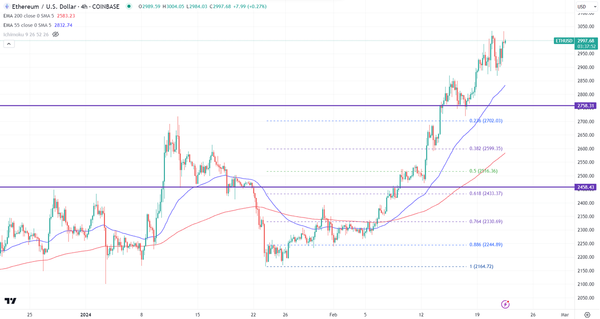 ETHUSD recovered after a minor sell-off. It hit a high of $3032.02 at the time of writing and is currently trading around $2989.50.