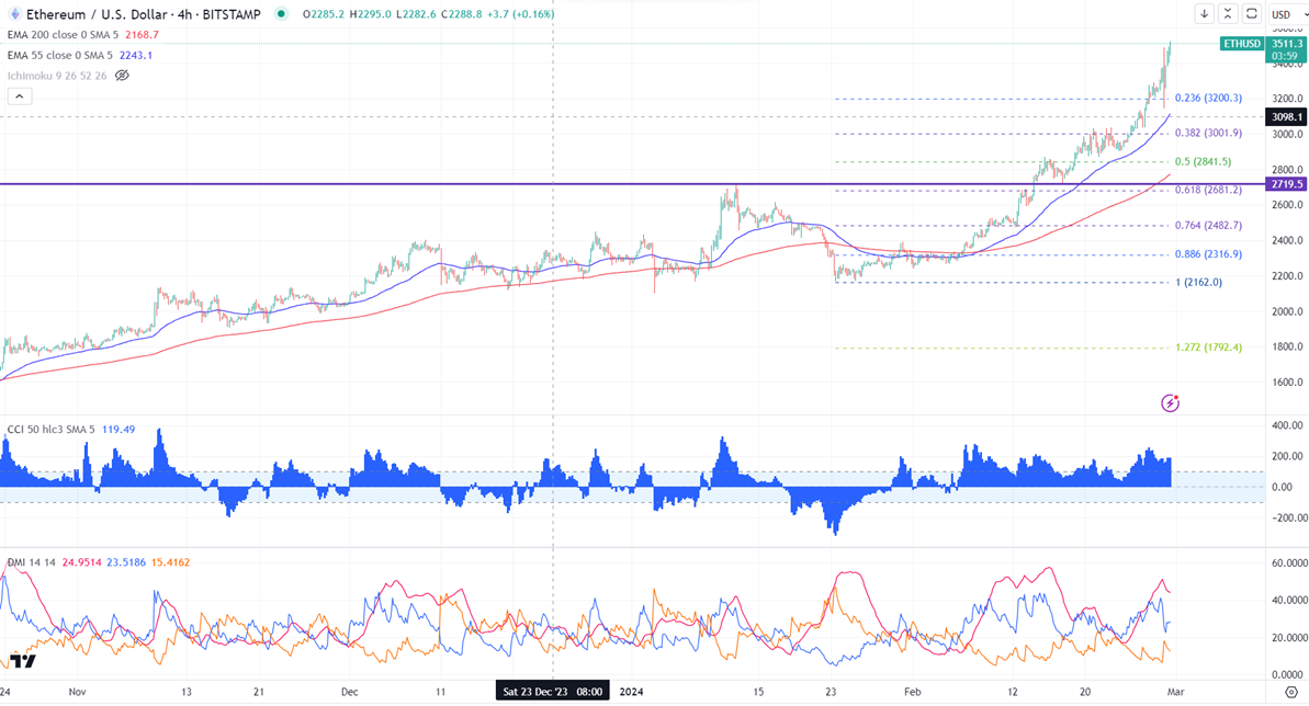 ETHUSD is trading higher for the fifth consecutive day. It hit a high of $3521 at the time of writing and is currently trading around $3518.