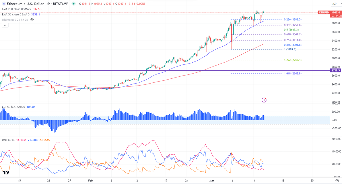 ETHUSD trades flat ahead of the Decun upgrade. It hit a high of $4095 and is currently trading around $4048.