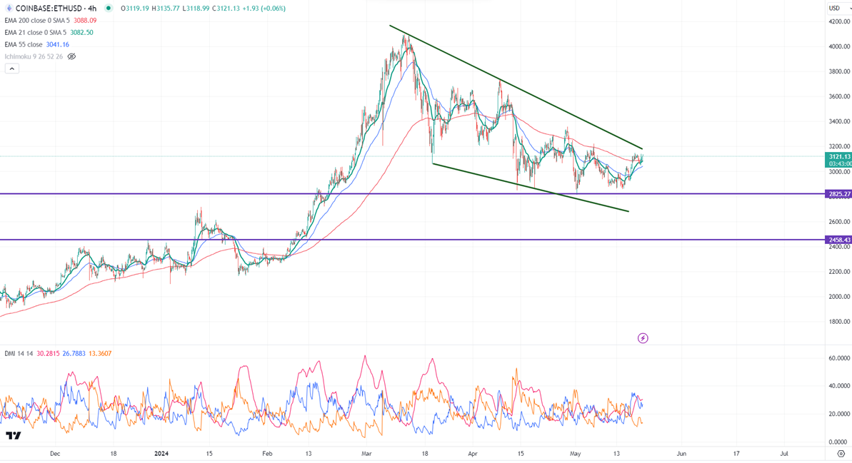 ETHUSD holds above $3100 amid upbeat market sentiment. It hit a high of $3127 at the time of writing and is currently trading around $3125.