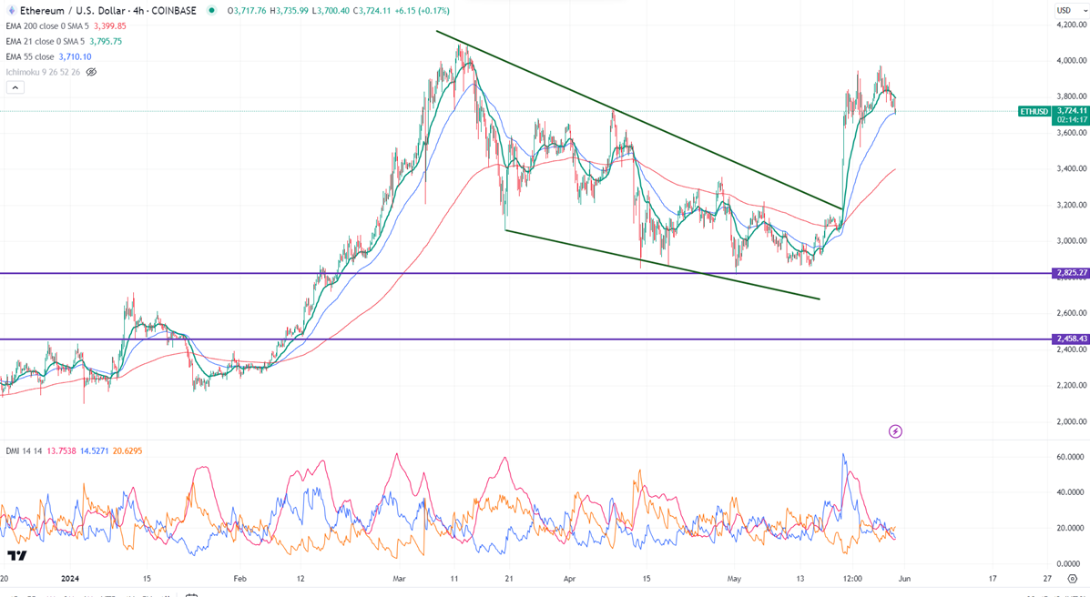 ETHUSD hits multi- months high on upbeat market sentiment. It hit a low of $3700 yesterday and is currently trading around $3721.50.