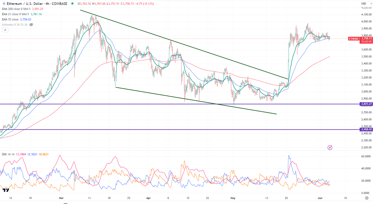 ETHUSD has consolidated between $3973 and $3700for past one week.It hit a high of $3850 yesterday and is currently trading around $3756.