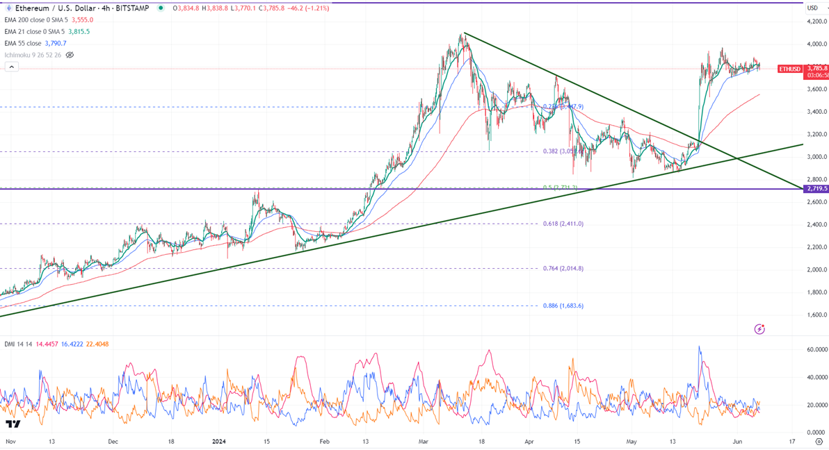 ETHUSD showed a minor sell-off following the footsteps of BTC.It hit a low of $3770 at the time of writing and is currently trading around $3790.30.