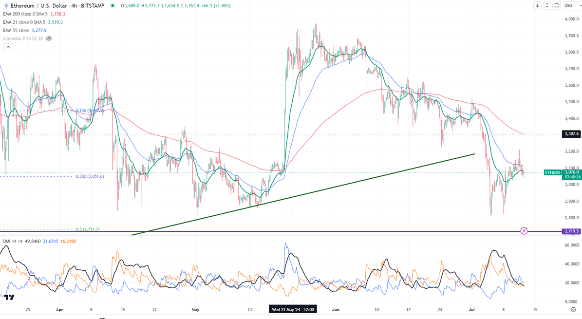 ETHUSD pared some of its gains on risk aversion. It hit a high of $3213 yesterday and is currently trading at around $3074.90.