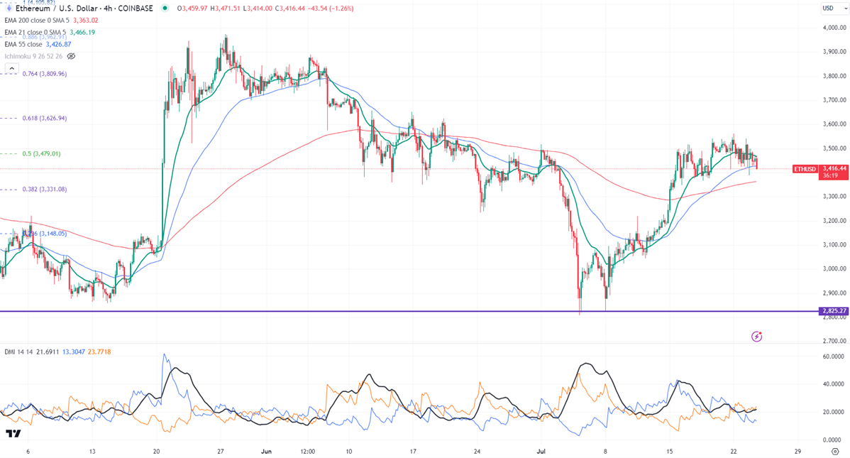 ETHUSD is trading flat after ETH ETF started trading yesterday. It hit a low of $3390 yesterday and is currently trading at around $3428.