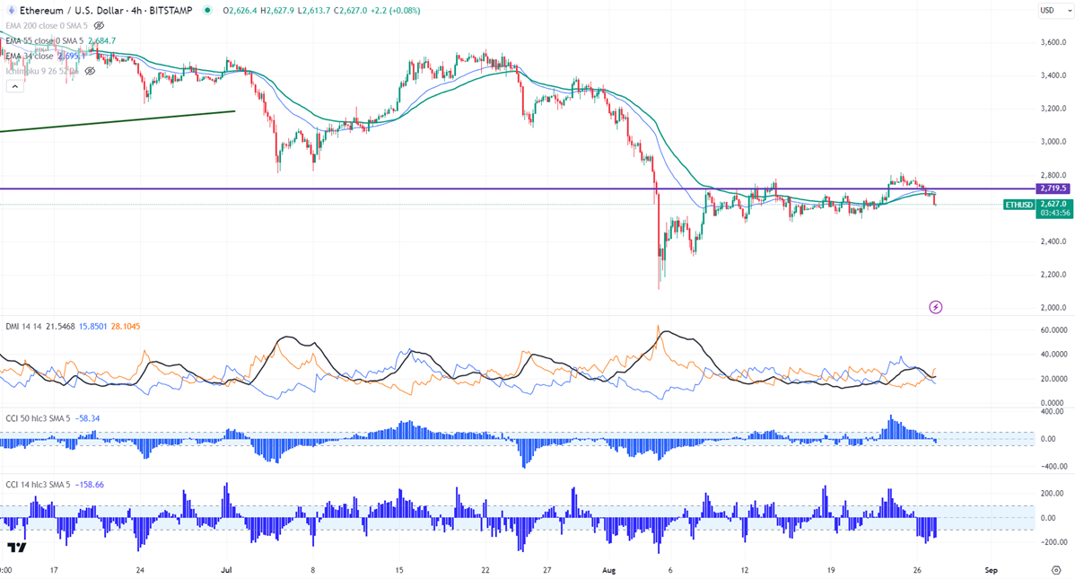 ETHUSD declined slightly on weak market sentiment. It hit a low of $2613 at the time of writing and is currently trading at around $2620
