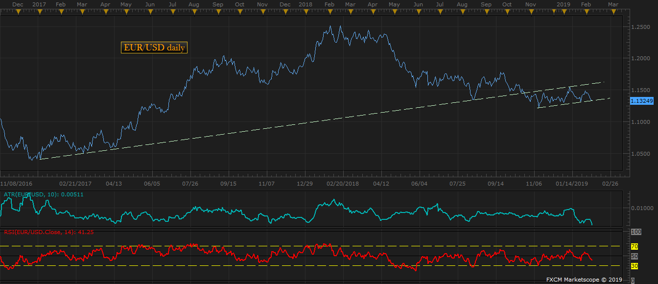 Euro is currently trading at a key rising trend-line support - a break of which could lead the single currency to as low as 1.12 against the USD.