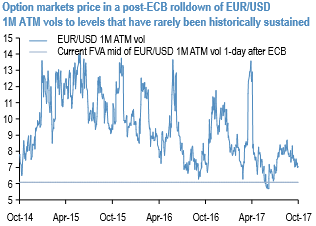 Extreme low sector correlation is accelerating the process: One other key market metric at all-time lows is the average pair-wise correlation between sector prices. We break-down the index vol into single stock vol and correlation components (as measured in dispersion). We find evidence that the dispersion of returns between is a key driver of the recent weakness of European index vols. However, it’s also evident that index vol itself is under pressure.