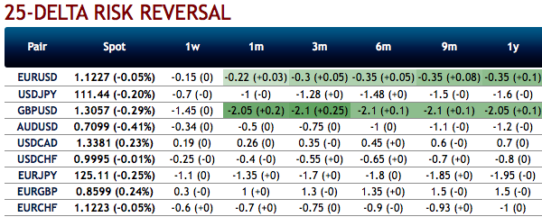 Hedge EUR-denominated income via risk reversals (RRs): The bearish neutral RRs of all euro crosses (except EURGBP) across all tenors have still been signaling downside risks.
