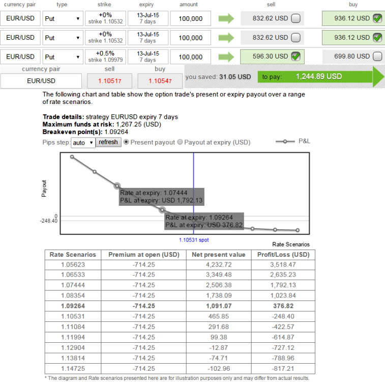 So, buying 2 lots of ATM 0.5 delta puts would mean an equivalent outrights to a short (sell) 50,000 EUR/USD position on each lot in the underlying FX spot and simultaneously short 1 lot of (0.5%) In-The-Money Put option with positive theta of the same maturity.
