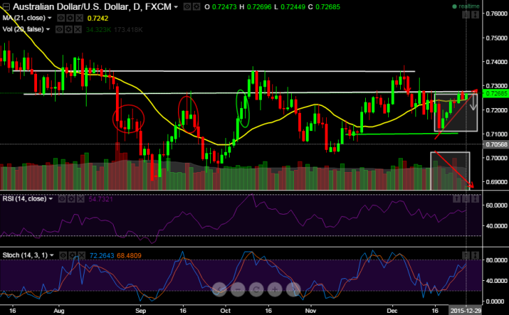 The pair is inching shy over 21 day moving average curve. So, it may bounce back for sure but don't expect the sharp shoot up. One can carry bullish attitude in short term only after a decisive breach of 0.7282 and breach above 0.7363 in order to construct bullish strategies in long term.