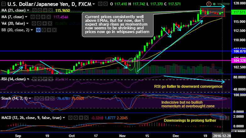 The current prices have consistently been spiking well above DMAs on daily EMAs so far on both daily and weekly plotting, but for now, don't expect the sharp rallies nor a steep slump, and it is better to devise trading plans in range bounded trend for sometime.
