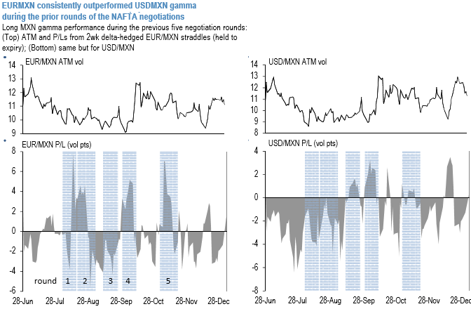 An analysis of MXN gamma performance during the five previous rounds of negotiations (refer above chart) shows that EURMXN tends to consistently outperform USDMXN around these events, perhaps because the more liquid and closely watched USD-vol has tended to attract the bulk of the hedging flows. EURMXN 2w straddles exhibited significant positive returns around two rounds of talks, modest gains in two others and losses during only one round.