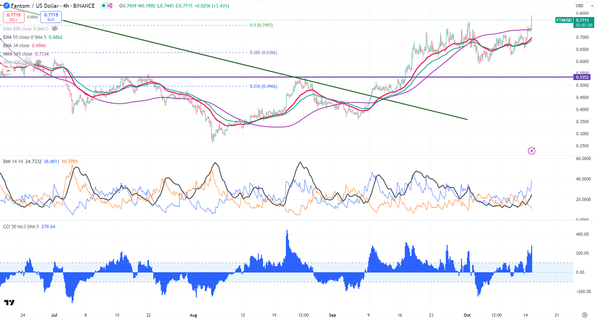 FTMUSD surged more than 30% in this month. The pair surged more than 5% today with robust trading volume of $457 million. The pair holds well above the short-term (34 and 55 EMA) and long-term moving average. It hit a high of $0.7892 and is currently trading around $0.7687.
