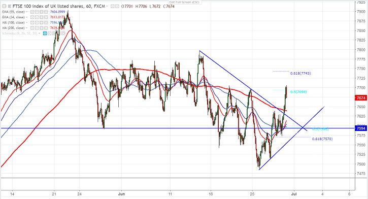 - FTSE100 recovered more than 200 points from low of 7486 made on Jun 25th 2018. It has broekn minor trend line resistance 7630 and also trading slightly above 200-H MA at 7640. The index hits high of 7695 and iss currently trading around 7680.