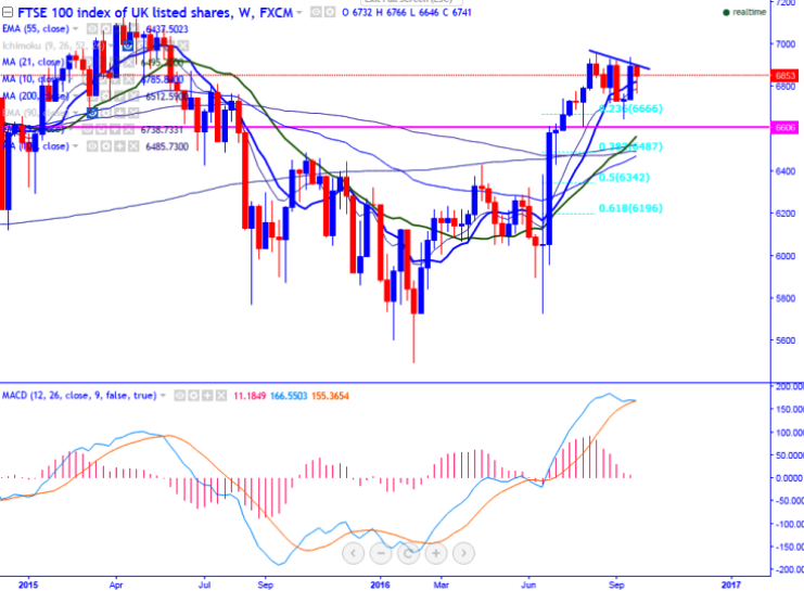 - FTSE100 has formed a temporary top around 6956 and any major trend reversal can happen only above that level.