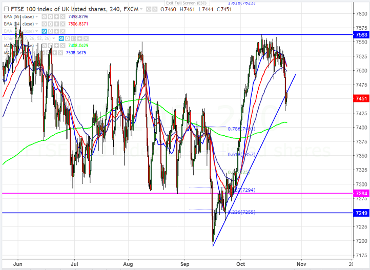 - FTSE100 has formed a temporary top around 7559 and started to decline sharply from that level. The index dipped till 7428 and is currently trading around 7450.