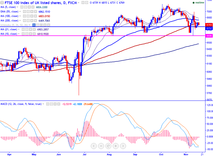 - FTSE100 is facing strong resistance at 7000 and any break above will take the index till 7130/7306 (1.13% retracement of 7127 and 5494)/7470 (161.8% retracement of 7130 and 6611).The minor resistance is around 6835 (5- day MA)/6865 (55- day EMA).
