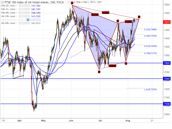 - FTSE100 has formed a temporary top around 7535 and slightly declined from that level. The index declined till 7514 and is currently trading around 7516.