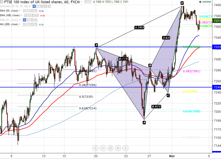 - FTSE100 has formed Bearish Butterfly pattern in the hourly chart and is currently trading around 7361.