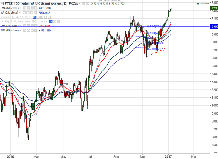 - The index made a record high of 7238 at the time of writing and longest run of record close since 1997. The index is currently trading at 7237.