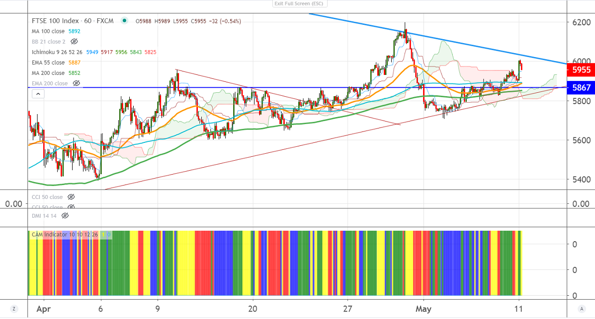 FTSE110 recovered sharply from a low of 5710 on surge in the global stock. UK markets started to trade higher after Government eases lockdown. It hits high of 6007 at the time of writing and is currently trading around 5954.