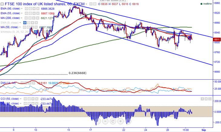 - FTSE100 is facing strong resistance at 6865 (200 –HMA) and any break above 6865 will confirm minor bullishness. Any break above 200-HMA will take the index to next level till 5955/6000.