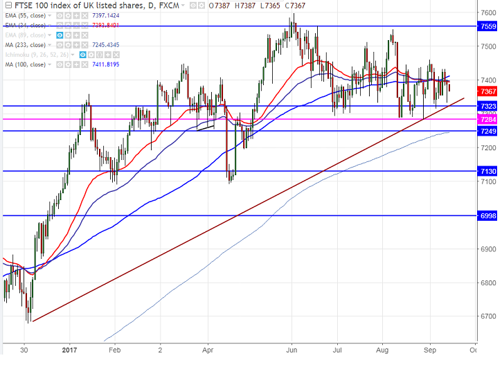 - FTSE100 is trading in narrow range between 7282 and 7459 for the past one- month. The index has once again shown a minor dip after hitting high of 7432 on Tuesday and is currently trading around 7374.