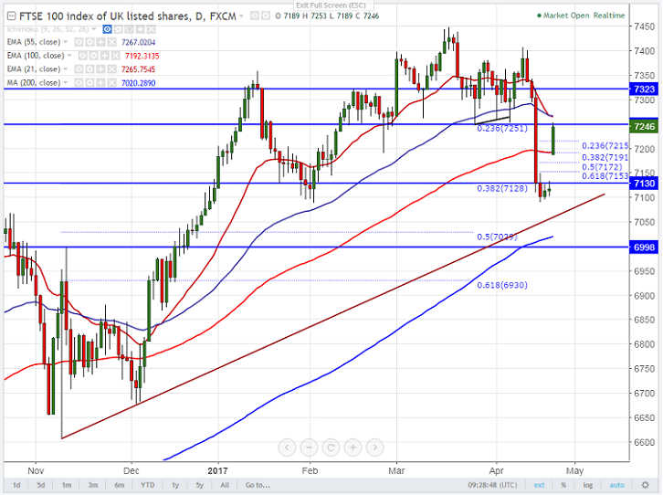 - FTSE100 has shown a huge recovery in European session on account of first round of French elections. The index broken psychological resistance of 7200 and jumped till 7253 at the time of writing.