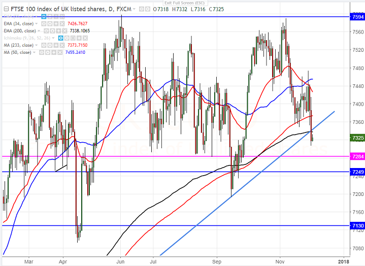 - FTSE100 is trading weak for the past two days after showing a minor recovery till 7473. The index breaks major support 7340 level and closed slightly below trend line support. The index dipped till 7316 and is currently trading around 7329.