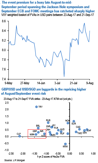 GBPUSD and USDSGD are two that fit the bill (refer above chart), with low nominal forward vols for the period covering the Jackson Hole symposium and the September ECB and Fed meetings (theoretical 23-Aug-17 to 21-Sep-17 FVA strike 7.5 for GBP, 5.0 for USDSGD) that are low by historical standards and price in only thin (< 0.5 vol) premium over pre-event dates.