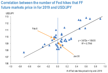 The number of Fed hikes that the FF future markets are pricing in for 2019 has continued to have a relatively strong correlation with USDJPY (refer 1stchart). FF future markets did not price in any hike even before the FOMC on January 30th.
