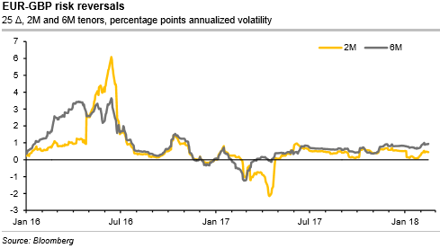 Hedging against such circumstance seems quite cheaper: 2M risk reversals are trading close to zero, and 2M ATM volatility in EURGBP is still trading at quite a low level (refer 2nd chart). Undeniably, if the expiry of the March deadline would be only the result of negotiating tactics, this does not imply that a timely agreement by October will fail. However, the failure to meet the March deadline certainly does not make an agreement more likely. On the contrary, the “risk” increases with every expired deadline. And this should at least increase the insurance premium for GBP weakness in October.