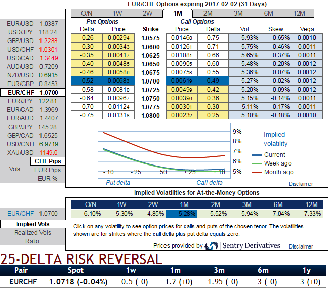 Please be informed that the implied volatilities of EURCHF ATM contracts of all expiries have still been the least among G10 currency segment. While positively skewed 1m IVs suggest the OTM put are on higher demand.