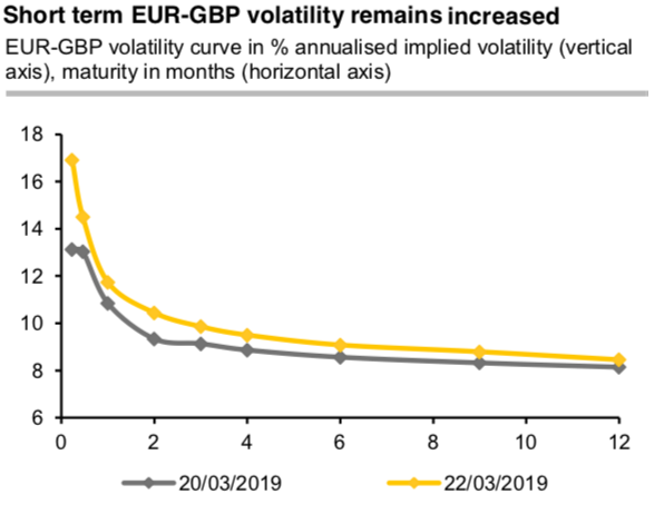 The IVs at the short end did not ease at all but instead rose further (refer 1st chart). That does not surprise as the market never believed in a no deal Brexit on 29th March in the first place otherwise the still relatively high GBP levels would be completely unjustifiable.