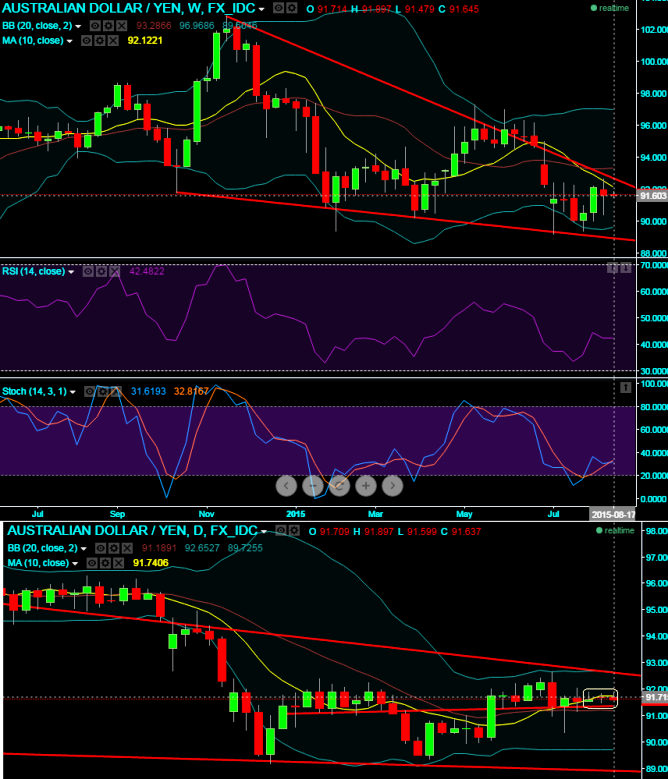 Both EOD and weekly graphs signal sideway to slightly bearish trend, the pair is currently testing a crucial support at around 91.678 levels on daily charts with the likely formation of falling wedge.