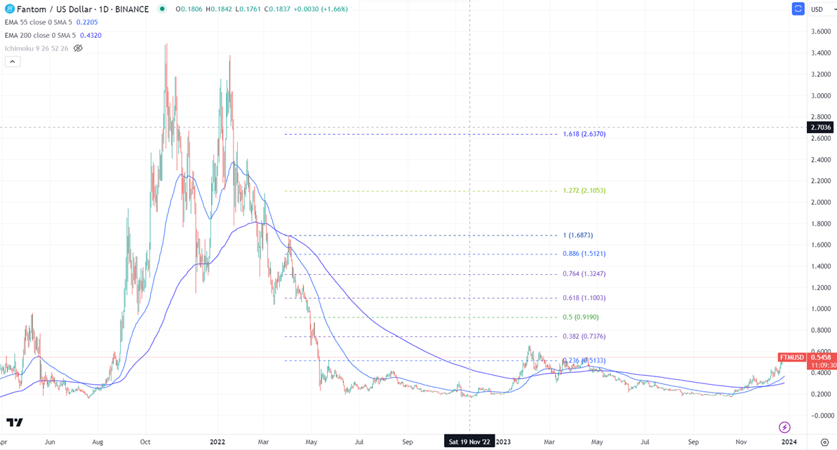 FTMUSD was the best performer and surged more than 50% in the past week. The pair holds well above the short-term (21 and 55 EMA) and long-term moving average. It hit a high of $0.5671 and is currently trading around $0.5438.