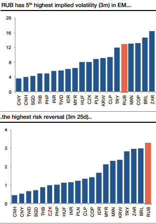 Shorting the RUB in volatility space is also very expensive: implied vol is one of the highest in EM and risk reversals are the highest. The skew-to-ATM volatility ratio has been rising steadily since early 2016, likely related to investors hedging bullish RUB price action. These volatility parameters favour structures that sell topside skew to cheapen up bullish USDRUB exposure.