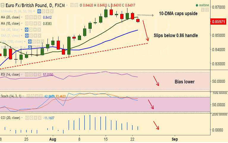 - Price action on the day is capped by stiff resistance by 10-DMA at 0.8628, while downside finds support at 20-DMA by 0.8536.