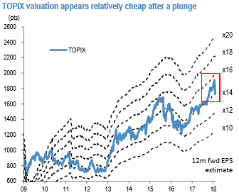 The valuation appears relatively cheap and this might motivate foreign investors to start buying Japanese stocks, buying JPY.