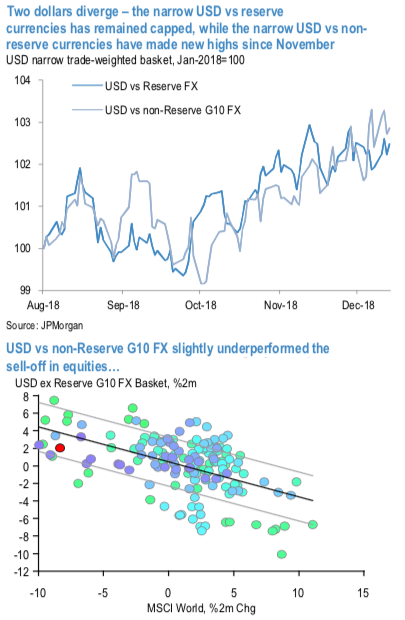 Since late November, as the US cycle risk repricing was unfolding, the dollar went on to make new highs versus its narrow non-reserve FX basket, while narrower US rate spreads helped contain USD strength versus other reserve currency peers (refer 1stchart). From this “two narrow dollars” perspective, the dollar has modestly undershot non-reserve G10 currencies (by 1.7%) given the magnitude of sell-off of global equities (refer 2ndchart). But the USD has remained unusually resilient against other reserve currencies given the narrowing of rate spreads, staying flat rather than declining 1% as a hybrid rate/yield curve spread model might suggest.