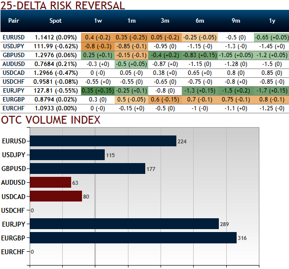 The OTC volume index shows volume traded in the past 24-hours versus a rolling one-month daily average. While not capturing all OTC flow, the index is a barometer of volume on liquid contracts for different crosses. Values over 100 indicate volume higher than the average, values under 100 indicate volume lower than the average.