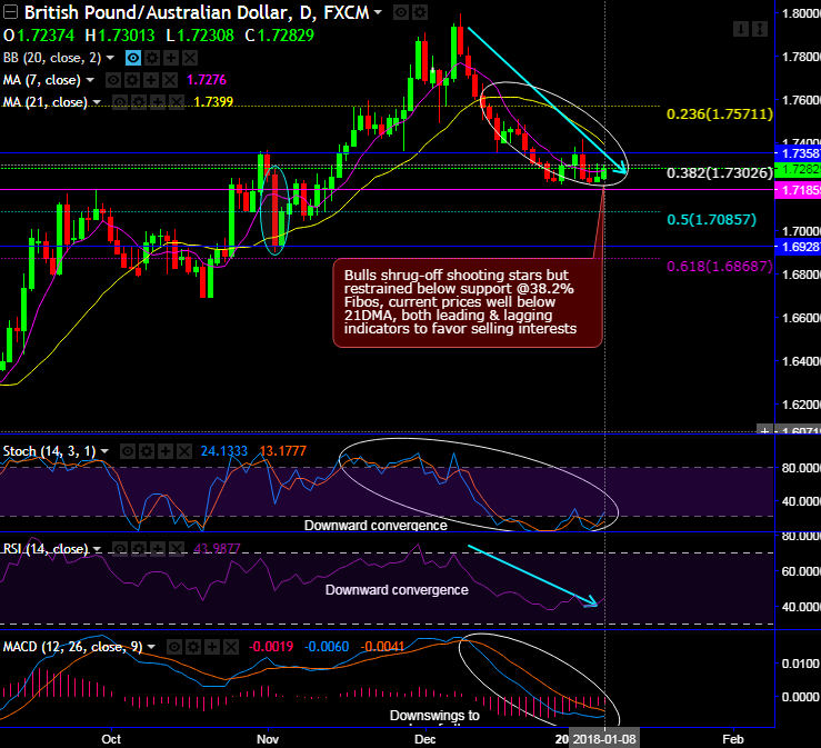 Trade tips: Contemplating above technical reasoning, amid ongoing rallies but restrained below 38.2% Fibonacci (today highs exactly at 1.7301 levels) we could foresee more dips on cards with 1.7185 acting as the strong support.