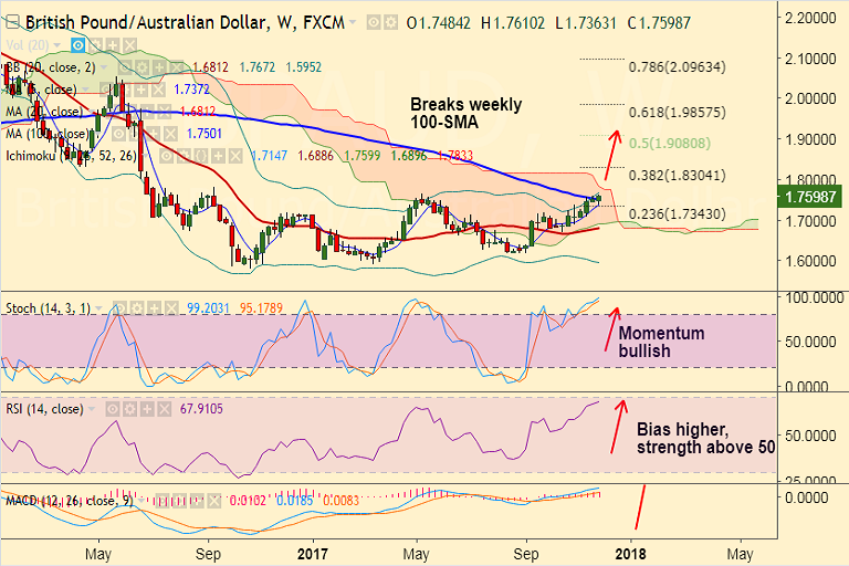 - GBP/AUD extends grind above 100-week SMA at 1.7501, bias higher.