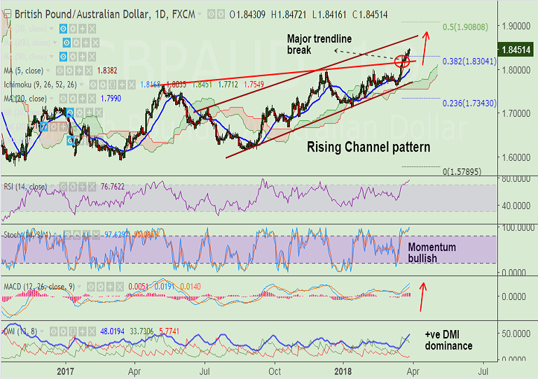 Support levels - 1.84, 1.8381 (5-DMA), 1.83 (38.2% Fib), 1.82 (trendline), 1.8050 (Mar 19 low), 1.7990 (20-DMA)
